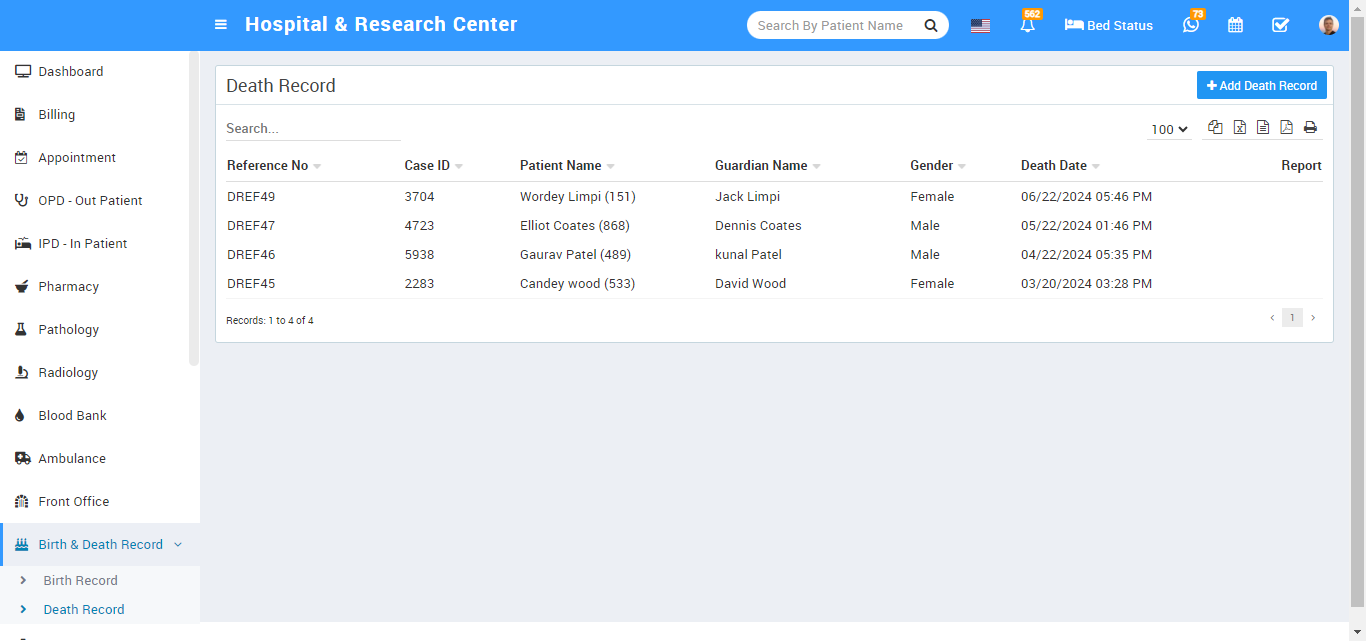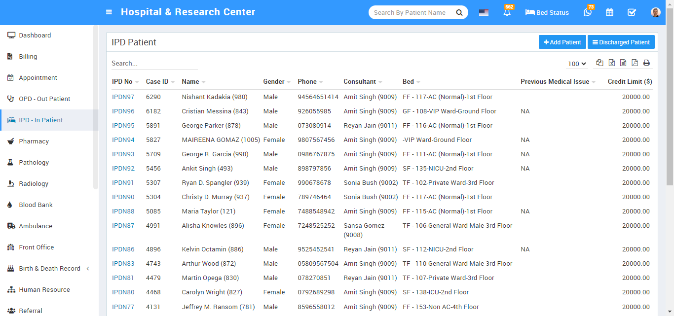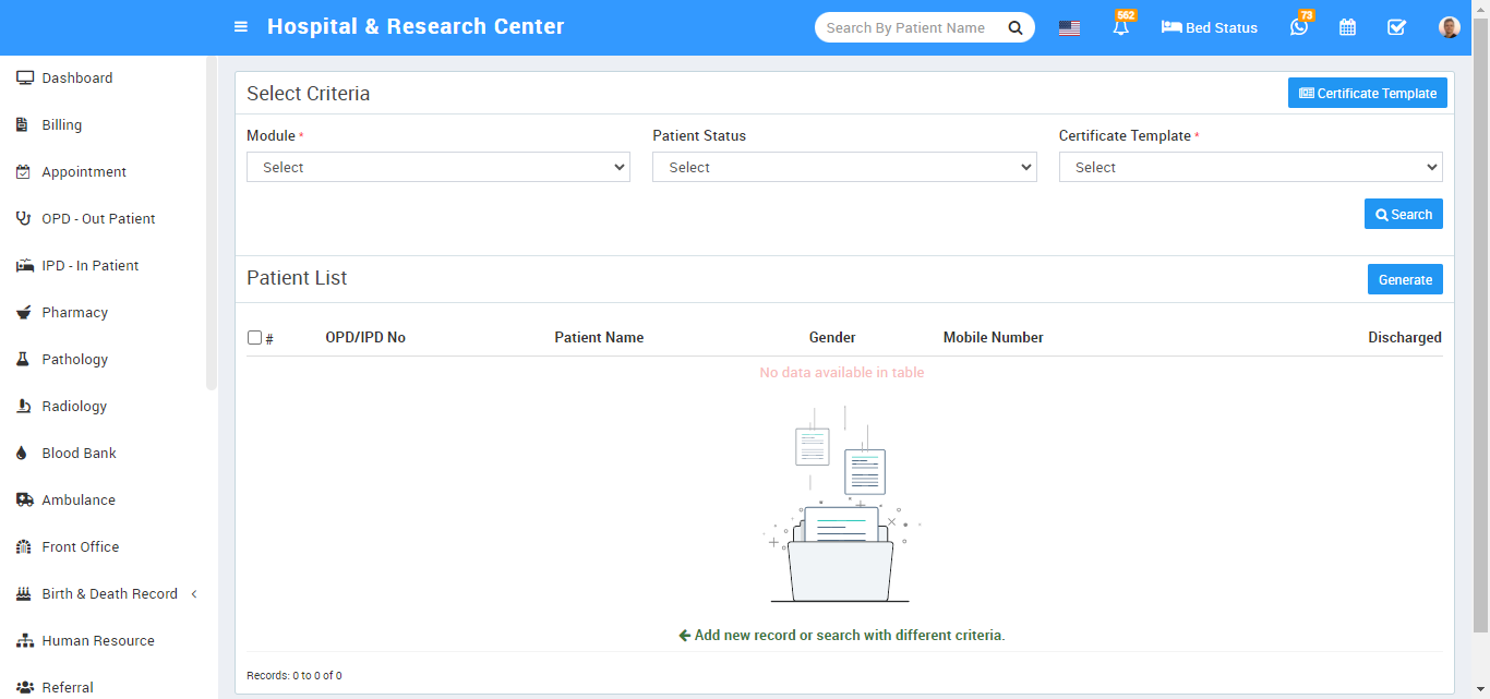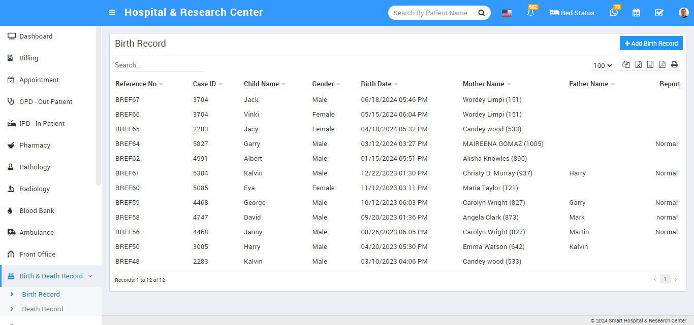 Custom Reports: Generates detailed reports on various aspects of hospital management, such as patient demographics, treatment outcomes, and financial performance.